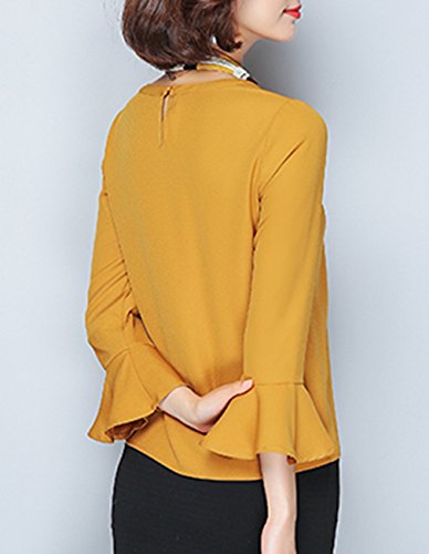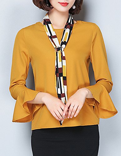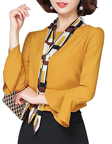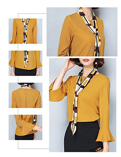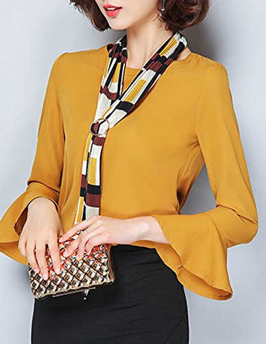 レディース ブラウス シフォン 長袖 オフィス リボン フレア袖 トップス (M, イエロー)