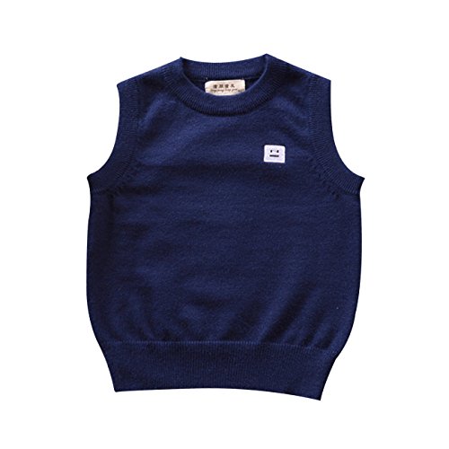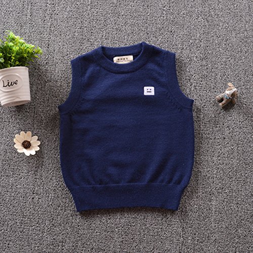 子供 ベスト クルーネック 袖なし キッズ ニット セーター シンプル スクール 男の子 女の子 秋 冬 (90cm, ダークブルー)