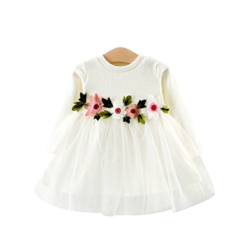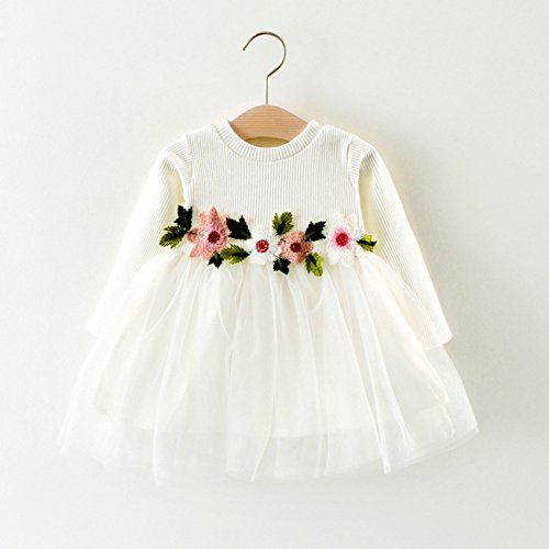 ワンピース 子供 ベビー 長袖 女の子 花柄 可愛い ベビードレス ガールズ ふわふわ チュール切り替え キッズドレス 七五三 出産祝い 通園 結婚式 (90, ホワイト)