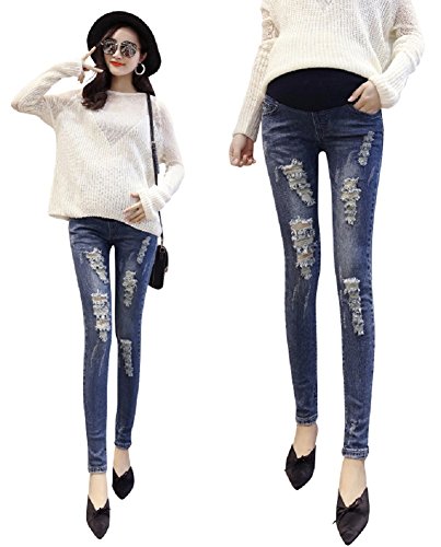 - ダメージ加工を施したおしゃれなデニム ジーンズ。 妊婦用とは思えないデザイン性で人気の商品です。