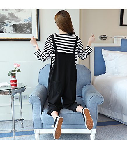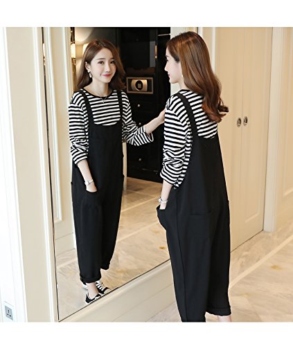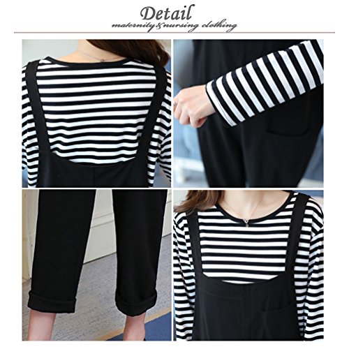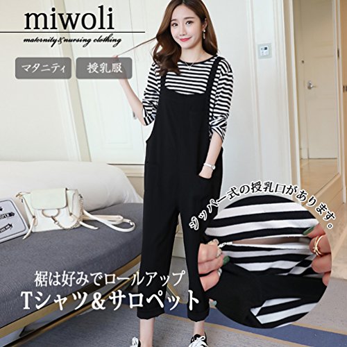 (Miwoluna) マタニティ サロペット オーバーオール 授乳服 ボーダー Tシャツ ブラック ゆったり セット 夏 授乳口付き 授乳口 結婚式 半袖 オフィス 黒 フォーマル 春夏 通勤 大きい サイズ 仕事 おしゃれ M
