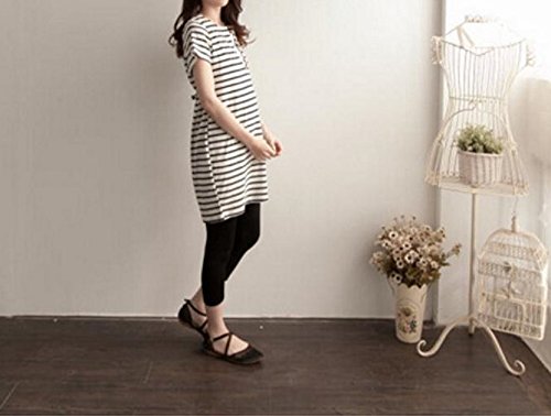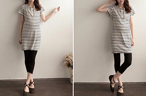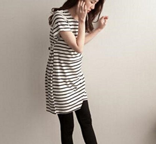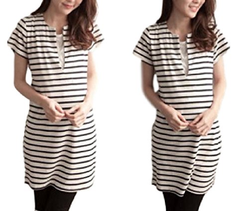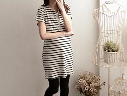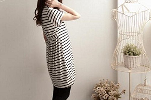 Miwoluna マタニティ ワンピース チュニック 授乳口 ボーダー ウエスト調整可能 (L, ホワイト x ブラック)