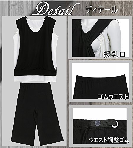 マタニティ ルームウェア 授乳服 パジャマ スウェット 妊婦服 スエット 半袖 半ズボン 授乳口 (黒×白, XL)