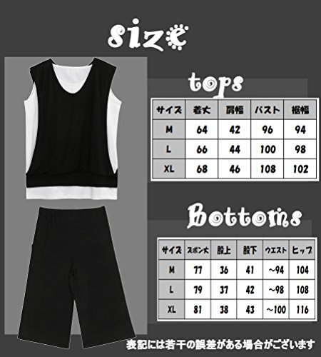 - サイズは【 M/L/XL 】から選んでいただけます。 XLトップス/サイズ約【 着丈68㎝・肩幅46㎝・バスト108㎝・裾幅102㎝ 】 XLボトムス/サイズ約【 ズボン丈81㎝・股上38㎝・股下43㎝・ウエスト~100㎝・ヒップ116cm 】 本体素材は 伸縮します。 ウエストは 調整 ゴムで調整できます。 サイズには 若干の誤差が ある場合が ございます。