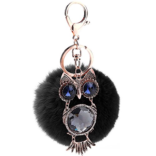 女性ファッション小物 ハンドバッグペンダント 合金のフクロウの人造毛皮の ふわふわのポンポンボールキーホルダー キーリング ブラック