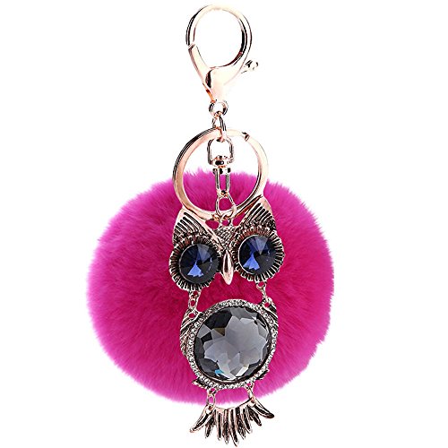 女性ファッション小物 ハンドバッグペンダント 合金のフクロウの人造毛皮の ふわふわのポンポンボールキーホルダー キーリング ローズレッド