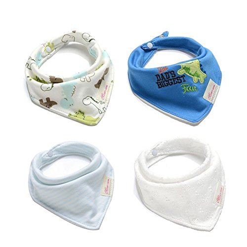 Baby Bandana Bibs are made from 100% organic, super absorbent cotton with a fleece back lining, leaving your baby clean, dry and comfortable! Very handy to use as a burp cloth or bib.;Our bibs come with adjustable snaps that are easy to use for parents. Your baby can't tear off our bibs! Multiple snaps are perfect for adjusting to a growing baby from 0-12 months.;Our unisex patterns are created with careful thought and designs to have your baby looking fashionable, even with drool.;Our bibs come in a 4-Pack and make a unique and adorable gift for new parents, baby showers, christmas, holiday gifts and so much more!;Featuring absorbent cotton/polyester cloth backed by absorbent fleece, our bandana bibs protect your teething baby's clothes & skin from drool & spit-up. No more changing outfits repeatedly!
