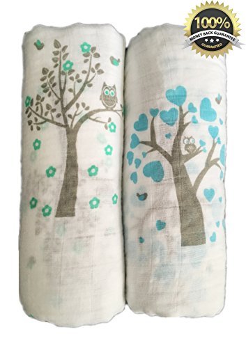 Muslin Swaddle Blankets - 47 inch x 47 inch Large Softest Muslin Swaddles - Half Price for Promotion - Tree Bird and Owl - Unisex for Boys or Girls - Lifetime Guarantee