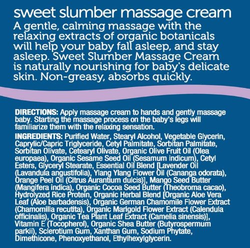 Mommys Bliss Sweet Slumber Massage Cream is a gentle, moisturizing cream used to relax baby for a good nights sleep. Massage Cream is enriched with the soothing extracts of lavender, chamomile and ylang ylang that are historically associated with relaxation and sleep.