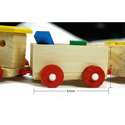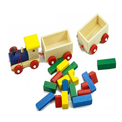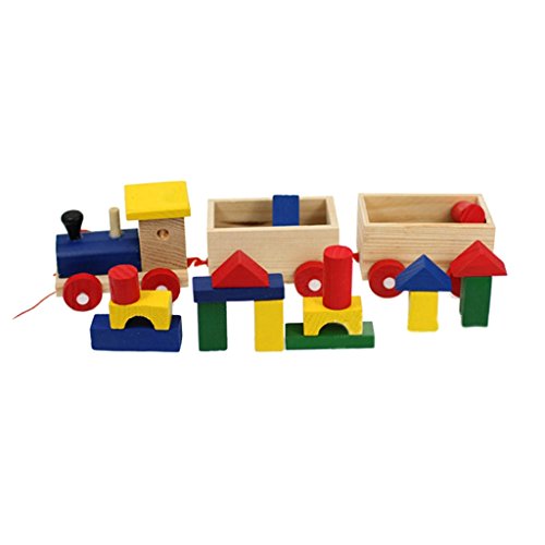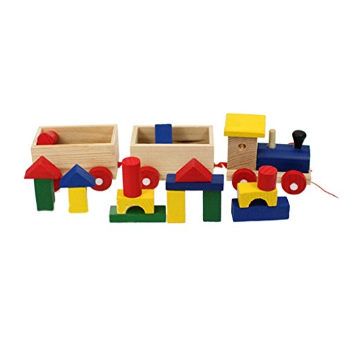 - 3つのスタックフル19カラフル電車の車両は、木製のブロックが表示されています。