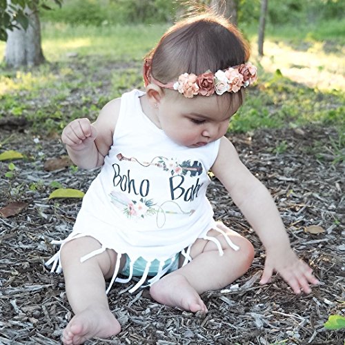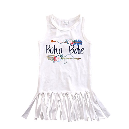 ベビーガールズホワイトノースリーブタッセルプリント" Boho Babe」Letter with Flowerパターンドレス カラー: ホワイト