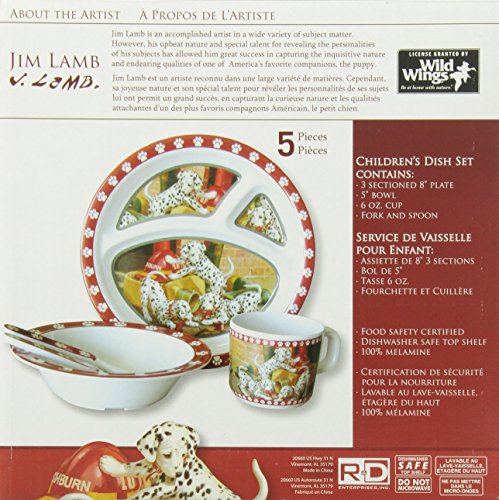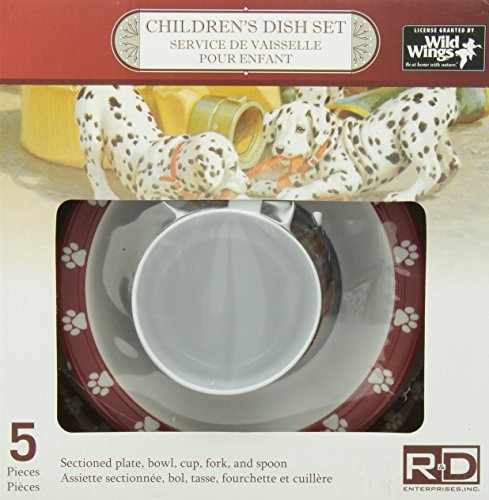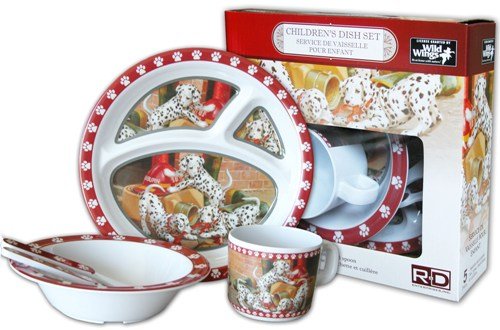 Licensed art by Wild Wings, this heavy weight, 100% melamine, dishwasher safe, 5 place set features Dalmation puppies at play. Consisting of an 8 inch, 3 sectioned plate, a 6 1/2 inch cereal bowl, and a kid sized fork and spoon, this Table Set is children and dishwasher safe.