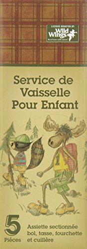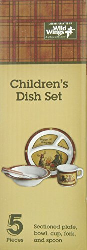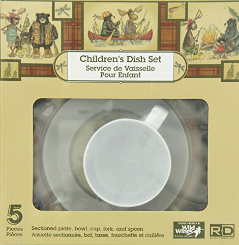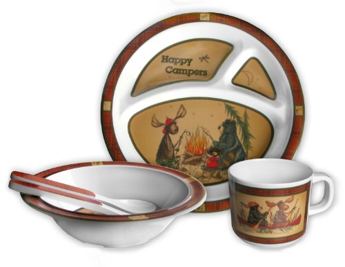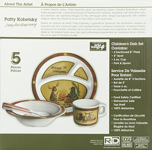 Licensed art by Wild Wings, this heavy weight, 100% melamine, dishwasher safe, 5 place set features Happy Camper animals. Consisting of an 8 inch, 3 sectioned plate, a 6 1/2 inch cereal bowl, and a kid sized fork and spoon, this Table Set is children and dishwasher safe.