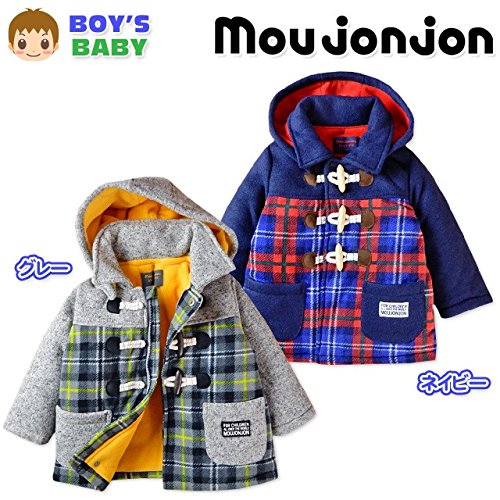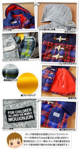 (ネイビー/95cm)ベビー服 男の子 アウター フルジップ ジャケット moujonjon ムージョンジョン 中綿 裏フリース チェック柄切替 無地 ワッペン装飾 フェイクトグルボタン 男児 ベビー