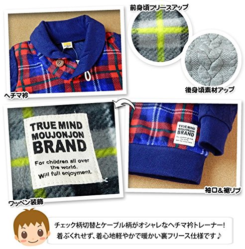 (ネイビー/90cm)ベビー服 男の子 トレーナー 長袖 Moujonjon ムージョンジョン 裏フリース チェック柄 ケーブル柄 ヘチマ衿 ワッペン装飾 男児 ベビー
