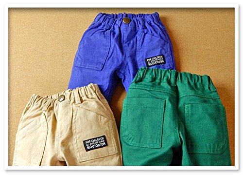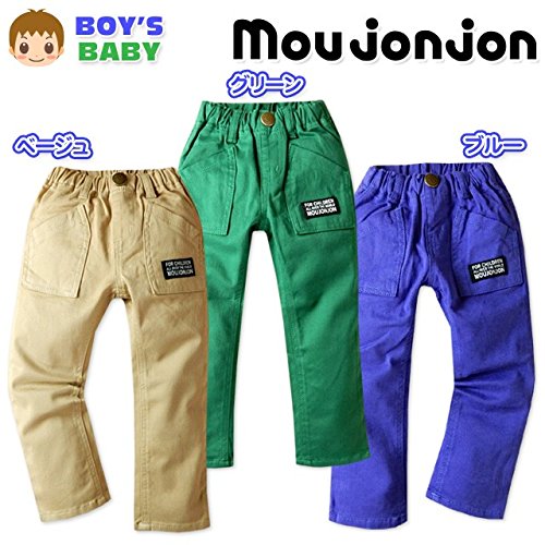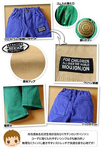 (グリーン/95cm)ベビー服 男の子 ロング ストレート パンツ ボトム Moujonjon ムージョンジョン サテン ストレッチ 無地 ワッペン装飾 ウエストゴム 男児 ベビー