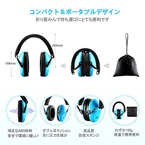 Mpow 防音 イヤーマフ 遮音値25dB 超弾力性 装着感抜群 フリーサイズ プロフェッショナル ANSI S3.19&CE EN352-1認証済み 聴覚保護/聴覚過敏/自閉症/騒音対策/勉強等様々な用途に 折り畳み型 収納袋付き 携帯便利 子供用 ブルー