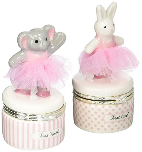 Color:Ballerinas Commemorate your little one's first milestones in our 2-piece set including hinged 'First Tooth' and 'First Curl' keepsake boxes with hand-painted ceramic elephant and bunny ballerinas on top