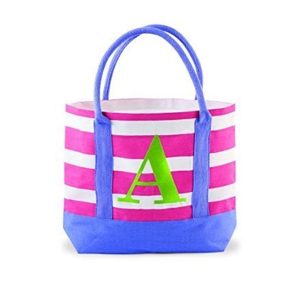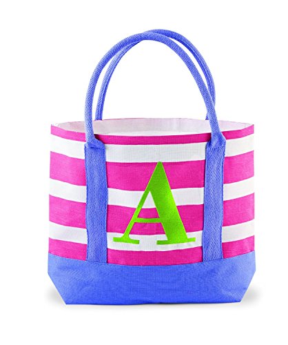 Colorful jute tote bag has large embroidered initial and soft cotton handle. Laminate wipe-clean interior and inside pocket.