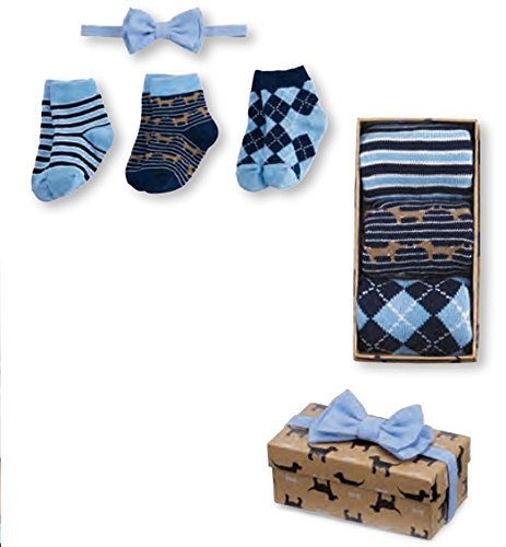 Mud Pie Little Buddy Baby Boy Sock & Bow Tie Gift Set 4-piece set., Boxed gift set includes three pairs of patterned cotton socks topped with adjustable chambray bow tie with Velcro closure., Size: 0-12 months., Makes a nice gift!, Part of Mud Pie's Little Buddy Collection.
