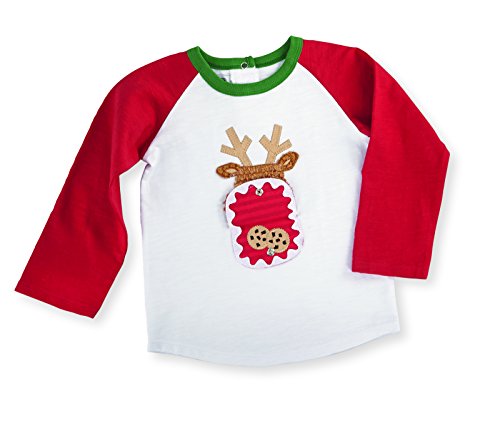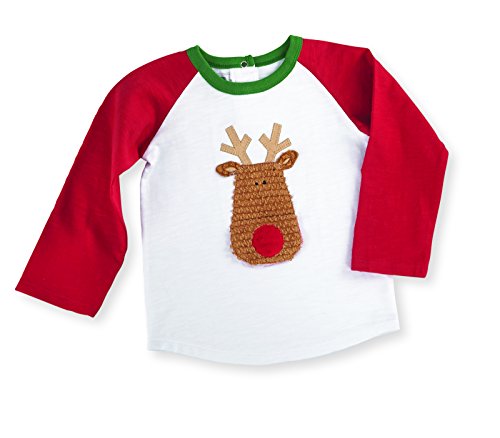 MUD PIEで少年はキュートに見え、お祭り、このトナカイラグランスタイルのTシャツ。コットンスラブシャツは、コントラスト袖とネックバインディング、背面スナップの前立てリブ編み毛糸トナカイのアップリケで表示するスナップ口開口部付きの豪華なクッキーを設定できます。のシャツだけのクリスマス楽しく。