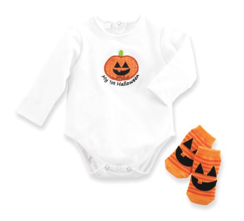 長袖ホワイトインターロックコットンソックス、揃いのハロウィンワンジーでハロウィンパンプキンのアップリケです。