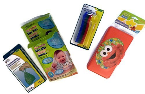 2 -6 Packs Angel of Mine Disposable Bibs with Crumb Catcher Pocket;1 Sesame Street Beginnings Baby Wipes Travel Case with Elmo Decoration;75 Angel of Mine Diaper Disposal Bags - Baby Powder Fragrance;12 Pack Angel of Mine Plastic Baby Spoons - BPA Free;Great pack for the baby on the go