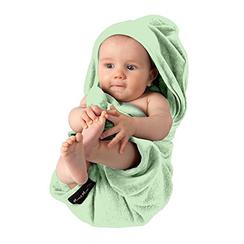 • 吸水性抜群でカラフルなフード付タオル。これ一枚で、下のお布団が濡れない。