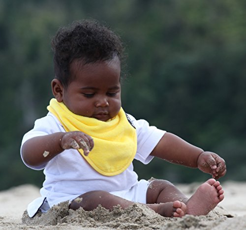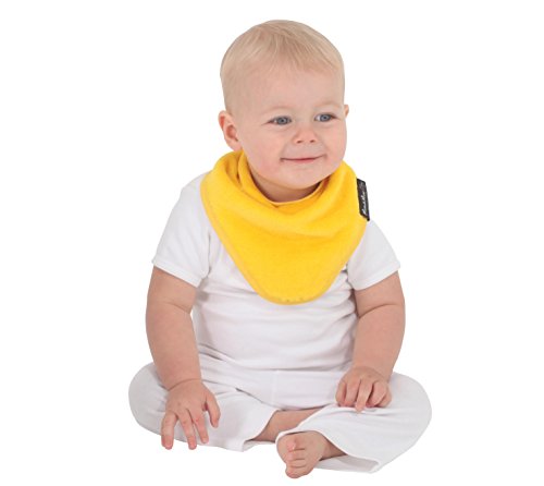 - よだれの多い赤ちゃんのためのビブ。吸水性抜群のタオル地で、裏地には耐水性ナイロンを使用しています。