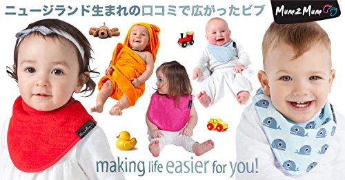 赤ちゃんのよだれに悩むママに。 ニュージーランド生まれ、Mum 2 Mum(マム トゥー マム)のバンダナワンダービブです。Mum 2 Mumは、数々の賞を受賞しており、その品質や使いやすさは世界のママが認めています。 ○1/3カップの水分を瞬時に吸収する抜群の吸水性。 よだれ、食事、授乳、吐き戻しなどどんな時でも、赤ちゃんをやさしく清潔に保ちます。裏地は耐水性ナイロンで、よだれがたくさん出ても、洋服が濡れにくいように工夫されています。 ○高級タオルのような柔らかさ、心地よい肌ざわり。 ○印象的で明るく綺麗な色使い。赤ちゃんをさらに可愛く見せてくれます。シンプルな無地なので毎日のお洋服とのコーディネートもらくらくです。 ☆バンダナ型は、あごのよだれを素早くキャッチ。よだれ対策には最もおすすめの形です。 【表地】コットン100% 【裏地】:ナイロン100% 【縁取り】コットン50%、ポリエステル50% 【留め具】スナップボタン2個 【大きさ】26cm×22cm 【対象年齢】4ヶ月~3歳(目安) 【首周り】約28cm / 32cm 【原産国】中国