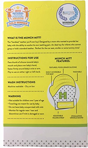 THE "HANDIEST" TEETHER YOU'LL EVER BUY, Plastic-free teething surface made of food-grade silicone, BPA & Phthalate free., Safety tested to exceed all federal safety requirements, including CPSC, ATSM regulations and the most current CPSIA., Easy access for baby to self soothe their teething pain. Hands-free for parents and protects baby's hands from skin damage from excess saliva and chewing., Sensory stimulating crinkle noise throughout mitt, black and white pattern & bright colors
