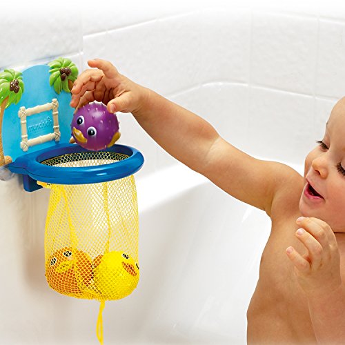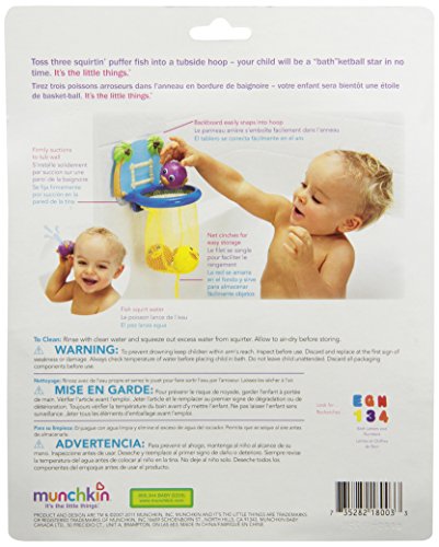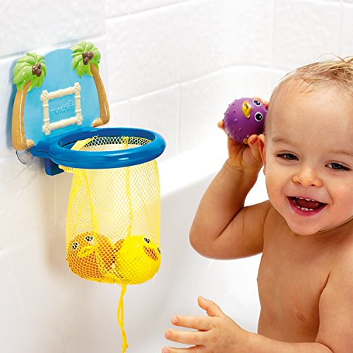 "This new basketball toy has real game for boys and girls.Strong suction cups secure the backboard to the tub wall for endless enjoyment.This bath toy comes with 3 colourful fish that act as balls and super squirter toys for even more fun.Kids can try to score points by tossing fish into hoop, or just play with the floating fish.Either way, this toy scores for keeping kids engaged in the tub."