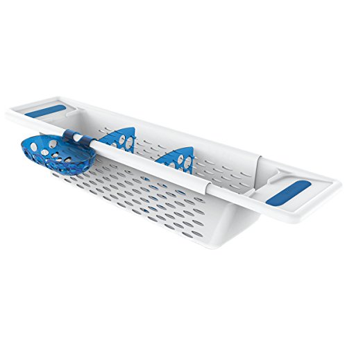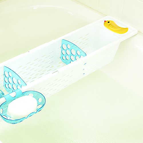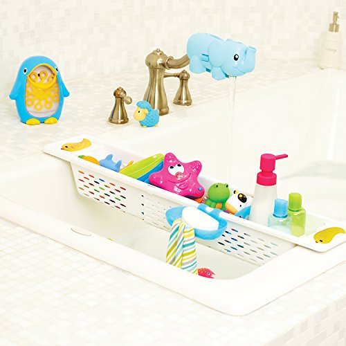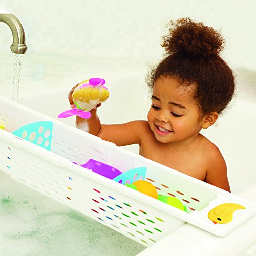 The Munchkin's Secure Grip Bath Caddy helps keep bath essentials within reach and clutter at bay during tub time. Do you feel like your tub has been taken over by your little squirt's toys? This handy caddy extends across the tub with Xtra Grip handles for added stability. The caddy holds toys at your child's level so they can grab what they want and even help clean up when bath time is over. The adjustable dividers allow you to customize storage for toys and shampoo. And as an added (major!) bonus, place the caddy between your little one and the bathtub spout to help protect against bumps and burns. When bath time is over, just slide the caddy to the back of the tub so it's out of the way for showers. With multiple drain holes, everything will dry quickly, helping prevent mildew build up.