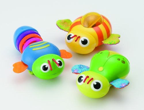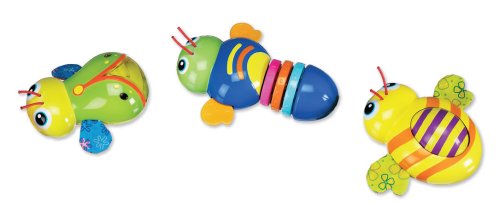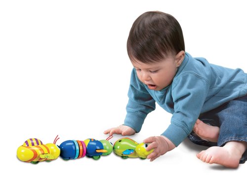 Cute easy to grasp bugs on wheels;Fun play that helps develops hand and eye coordination;Three different bugs link together with magnets;Wings crinkle, back spins, back lights up;Buggies is cute