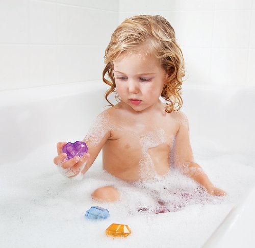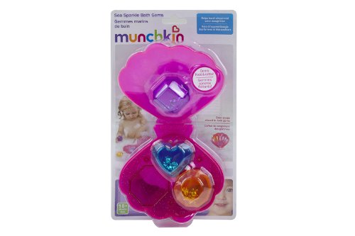 マンチキンのシー・スパークル・バスジェムは、貝殻の収納ケースと宝石(ジェム)の形をしたバストイが三個入った、楽しい水遊び用おもちゃです。宝石を振るとカシャカシャ音が鳴ります。宝石はお風呂の中に沈まずに浮かぶように作られています。使い終わったら、キラキラとしたラメが可愛いピンクの貝殻のケースに入れて収納する事ができます。