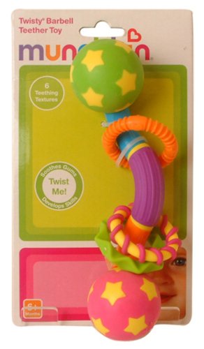 The Munchkin Twisty Barbell Teether Toy is great to help sooth your baby's gums when teething. While soothing your baby's gum this toy also helps to develop your baby's intuition and coordination skills. A great toy for at home or when out and about.