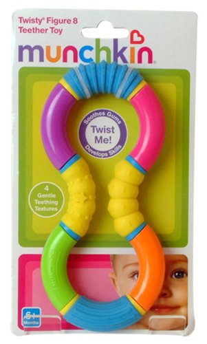 The Munchkin Twisty Figure 8 Teether Toy is great to help sooth your baby's gums when teething. While soothing your baby's gum this toy also helps to develop your baby's intuition and coordination skills. A great toy for at home or when out and about.
