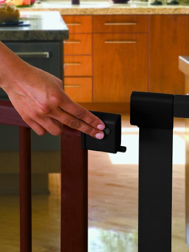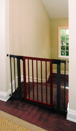 At 29-1/2 inches in height, the dark wood gate is ideal for keeping children or small pets safe. With the use of the three included 2-3/4-inch extensions, the gate accommodates openings from 29-1/2 to 40-1/2 inches wide for a custom fit virtually anywhere in your house. It can also extend up to 54 inches wide with the addition of 5-1/2-inch and 11-inch extensions, which are available separately. With the use of mounted wall cups for added stability, the gate can be used at the top of a staircase, in a door jam, or in a hallway.