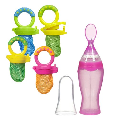 Textured handle easy to grasp. Ideal for 6+ months. Fresh Food Feeders Colors May Vary. Holds a 4 ounce jar of baby food. Spoon locks to prevent food from spilling