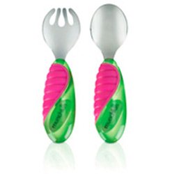 Large handles are easy to hold and ideal for right and left hand. Helps toddlers learn to feed themselves. Fork tines are rounded for safety.BPA and PVC free. Colors may vary, you may receive in one of the following colors: green/pink or blue/green.