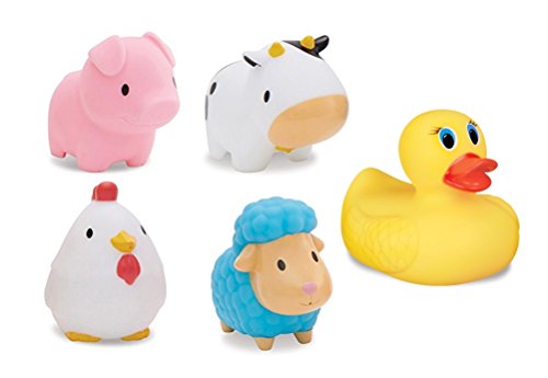 Includes 4 different water-squirting, floating barnyard animal friends (cow, sheep, chicken and pig);Fun way to teach animal names and sounds in the bath; Great for underwater bubbles and bath games;Helps baby develop fine motor skills; Ages 9+ months;White Hot Safety Disc reveals the word hot when bath water is too hot for baby; Fun, easy to grasp size and shape;Water tight to prevent sinking, squirting, and mildew