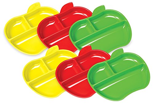 Three separate sections with sloping sides for easy scooping;Cute apple-shaped plates in fun colors - Plates stack and store neatly;BPA-free plates provides great value;6 Plus months;6 Lil Apple Plates