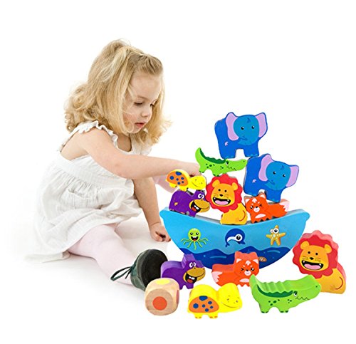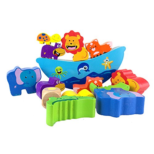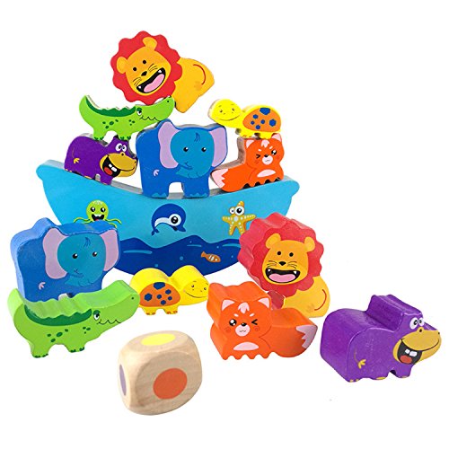 - 動物の積み木12個とボート1個が含まれ、ライオン、ゾウ、ワニ、カメ、カバ、キツネなどの楽しい動物の形をした積み木を積み上げます。