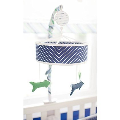 Lull your baby to sleep with our Follow Your Arrow in Navy Crib Mobile. ?The rotating circular music mobile features a chevron pattern with cute hand stitched arrows in navy and green. ?Fits standard size crib rails. ?Rotating wind up mobile plays Brahms's Lullaby. Remove from crib when baby begins to push up on hands and knees. ?Use from birth to about 5 months. ?Imported.
