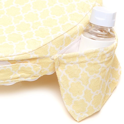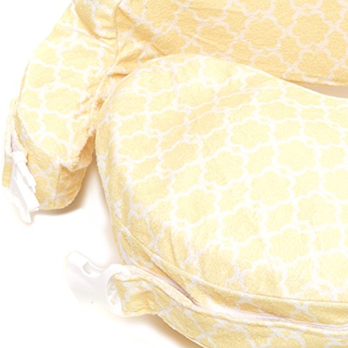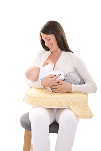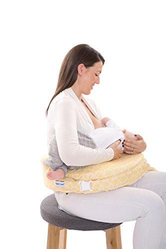 Extra soft baby-plush fabric slipcover stays fresh through dozens of washes;Wrap around design secures to the body helping mom and baby maintain positioning and latch-on; Double-featured strap with velcro and silent-release buckle for easy, one-hand use;Back rest helps you maintain good posture during feeding and prevents sore back and neck; Arm and elbow rests eliminate shoulder stress;Firm, flat cushion keeps baby from rolling;Convenient pocket keeps water bottles, burp cloths, phone, and other items within reach