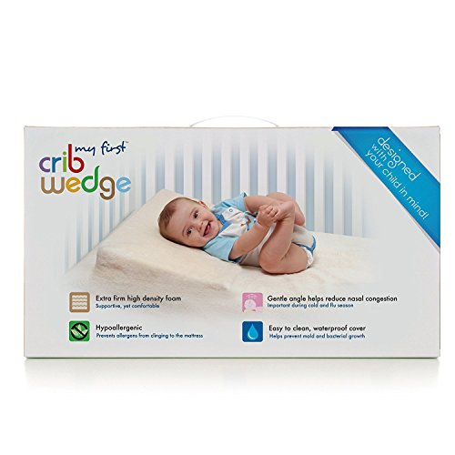 Designed with your child in mind, our My First crib wedge gently elevates your baby's head and torso so he can breathe better and provide a restful night of sleep. This is especially helpful if your baby has an earache or bronchial congestion. The My First crib wedge positions easily and securely under the crib sheet. Constructed of Certipur-US high density memory foam, our crib wedge is supportive, extra firm and hypoallergenic. The easy to clean waterproof cover is removable and helps prevent mold and bacterial growth. Part of our My First collection of infant and toddler bedding products to help promote safe and restful sleep.