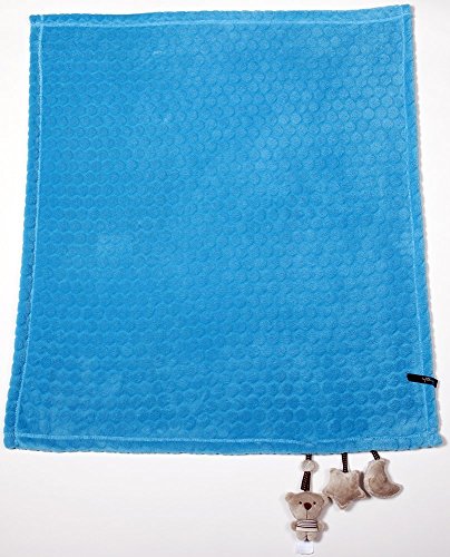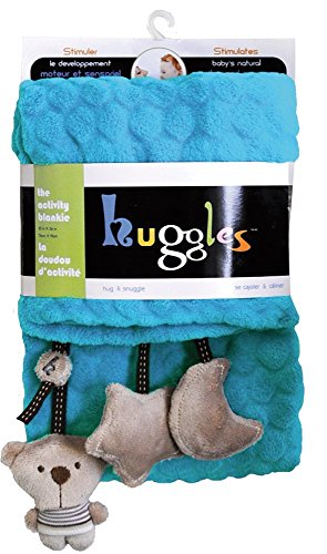 The My Friend Huggles Plush Micro Polyester Activity Blankie is made of incredibly soft, durable material ready for naptime or playtime. Because the fabric of this blanket is micro polyester, you get a tighter weave which is more resistant to runs, stretching and stains while remaining soft to the touch, durable and resilient against color fading. This geometrically textured blanket is the perfect size for cozying up and entertaining your little one. Attached to the blanket are three fun, plush toys; a snuggly bear, a star rattle and a squeaky moon. The My Friend Huggles Plush Micro Polyester Activity Blankie is the perfect on-the-go accessory for Mom's busy day; your active baby will stay warm and engaged. Beautifully made, each blanket measures 30 inches wide by 36 inches long and is available in a variety of colors to fit you and your baby's style. Easy care, machine washable.