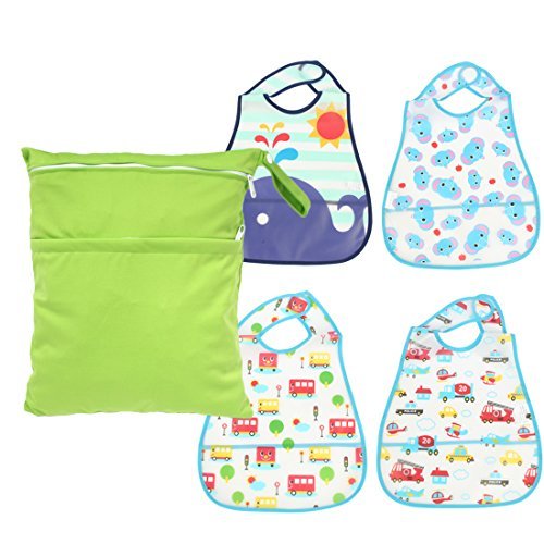 Great value! Set of 4 water resistant feeding bibs with food catcher pocket - bonus waterproof double zippered wet bag;Bibs features a unique catcher pocket reversible design that it captures food that falls during feeding when it is flipped forward. The pocket can be flipped back for clean-up or when your little one doesn't need the pocket. Easy to clean - washes off, dries quickly and stain resistant. 100% EVA;Can be rolled up for easy carrying; perfect for babies 6 months and up or toddlers;Bonus waterproof 2 in 1 wet bag features two zippered pockets to separate wet and dry items. Great for storing bibs and utensils when dining out or can be used for swimsuits, dirty/clean cloth diapers. Reusable, durable and lightweight. Hand or machine washable and hang dry;Dimensions: bibs - 14L x11W; waterproof wet bag - 12.25W x 14.25L