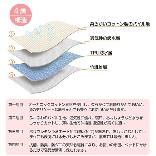 - 【4重構造で機能性抜群】オーガニックコットン綿100%+ふわふわのパイル生地+TPUポリウレタンラミネート加工 +抗菌、防臭、防ダニの滑り止め天然竹繊維100%。このおねしょシーツを使うみると、赤ちゃんのおねしょや吐き戻し等で敷布団が汚れるのを防ぎ、不安がすっかり解消いただけます。