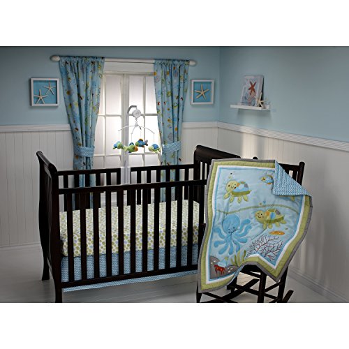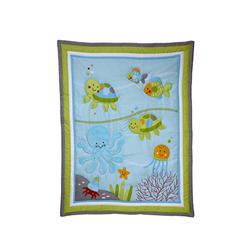 3枚ブルーグリーングレーマリンベビーベッド寝具セット、動物がテーマの新生児保育園ベッドセット幼児子ソフトTurtles太字の境界海水海洋波のようなストライプ毛布布団、ポリエステル綿